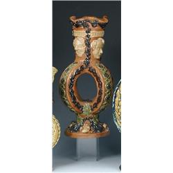A pair of ochre four handled candlesticks, the quatrefoil rims applied with dark brown scrolling vines above four cream coloured named masks, the arched handles and the circular feet decorated with green, cream and dark brown leaves, impressed marks, 31cm high (R) (2) £200-300