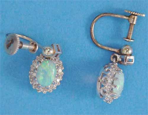 A pair of opal and diamond drop earrings, each claw-set in white gold with an oval opal in a border of diamonds on a single diamond suspension. £180-220