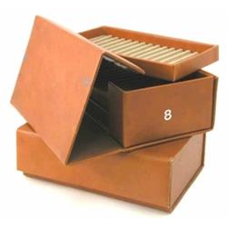 A pair of pen collecting cases, brown vinyl finish with three partitioned trays each 12ins...