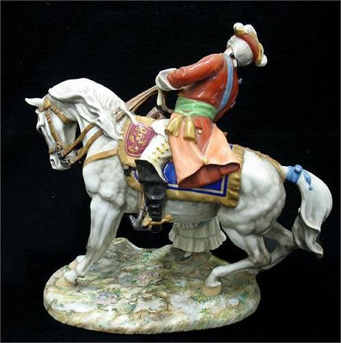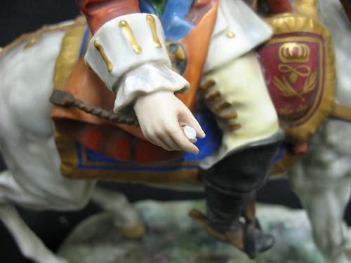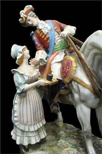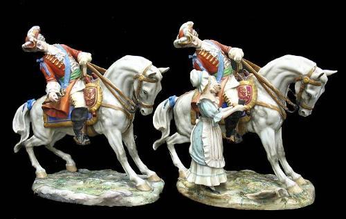A pair of porcelain Capo di Monte figurines; the first depicting soldier riding horse and the second depicting soldier on horse next to standing woman; early to mid 20th C.; 11" high x 13" x 6" (chip to top of riding crop on first figurine, no visible defects on second )