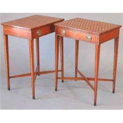 A pair of reproduction occasional tables, with parquetry and crossbanded walnut and kingwood tops, and partridgewood frieze drawers on square tapered legs with cross stretchers, 1ft.10ins £800-1,200