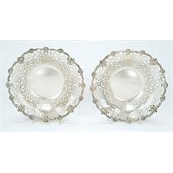 A pair of round fruit dishes, the scroll pierced sides with flower and 'C' scroll chased borders,...