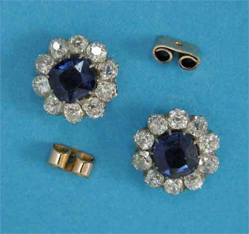 A pair of sapphire and diamond cluster earrings, each claw-set with a cushion shaped cornflower blue sapphire within a border of 10 old brilliant cut diamonds £500-800