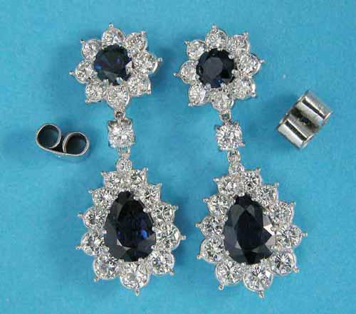 A pair of sapphire and diamond pendant earrings, each with a pear shaped sapphire bordered by 12 graduated brilliant cut diamonds suspended from a sapphire and diamond flowerhead cluster £2,000-2,500