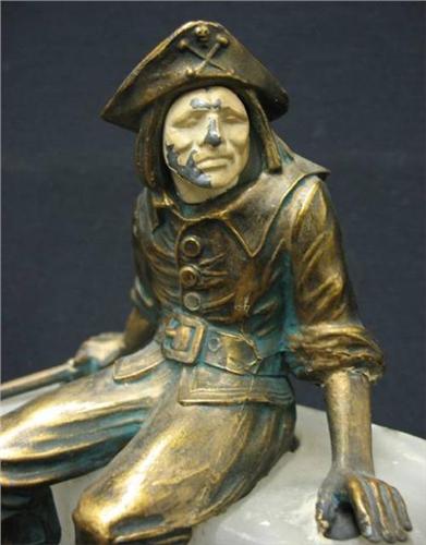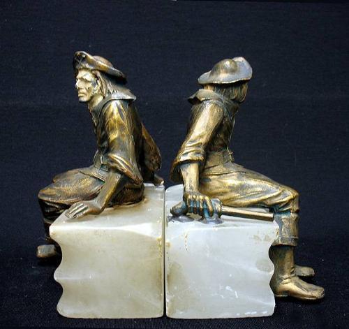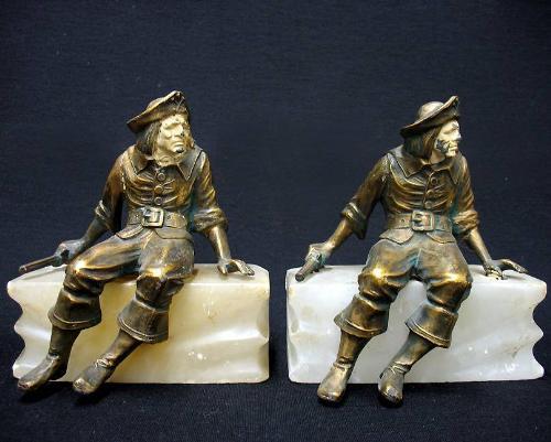 A pair of spelter figural bookends on alabaster bases; seated pirates holding pistols; painted faces; on rectangular alabaster bases; C.1900; 7" high x 5 3/4" x 4" (some paint loss on faces)