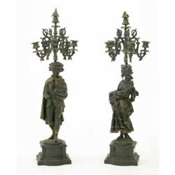 A pair of spelter five branch figural candelabrum, cast as a young boy playing the bagpipes and a girl with a tambourine supported on serpentine plinth bases, with gilt decoration throughout, loss to pipes, 38 ins £400-600