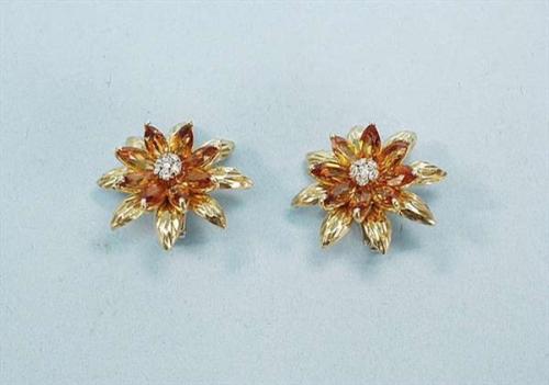 A pair of unusual 18 kt. yellow gold, citrine and diamond earrings. Each floral cluster set with marquise cut citrine and gold petals arround a central diamond cluster. Circa 1950's. 3500-4000