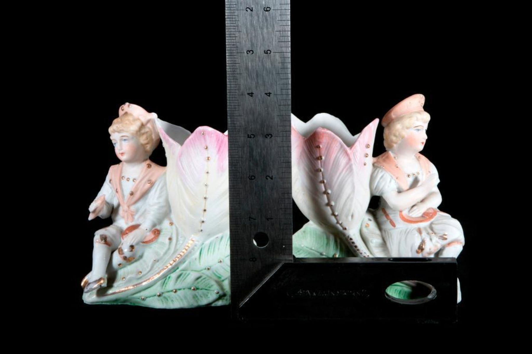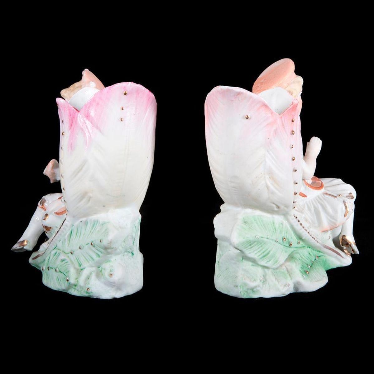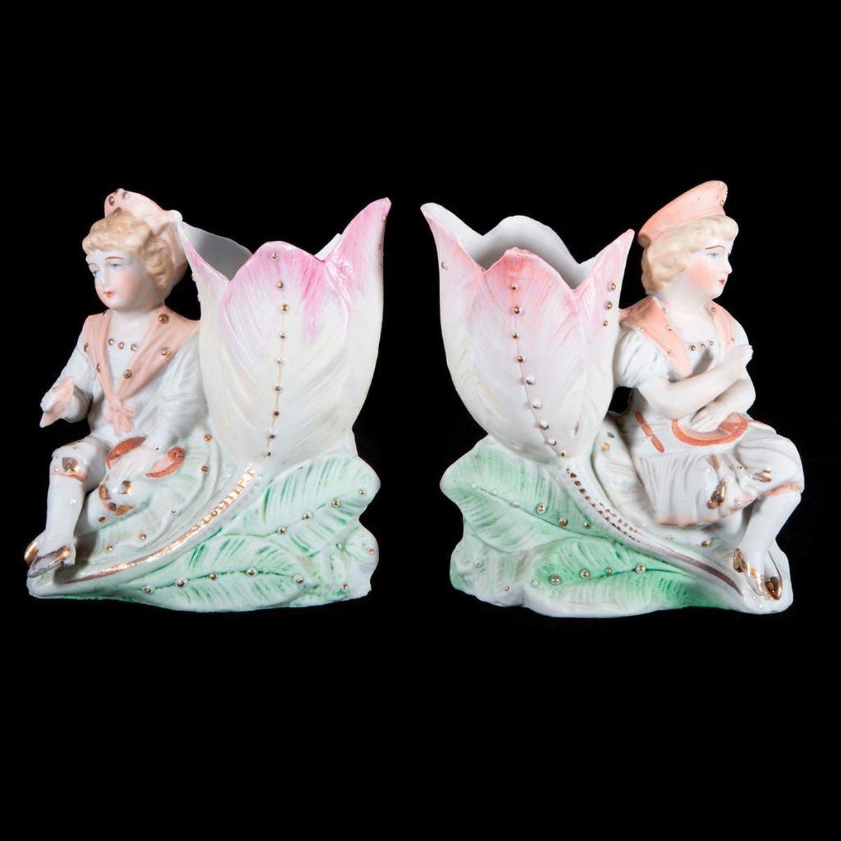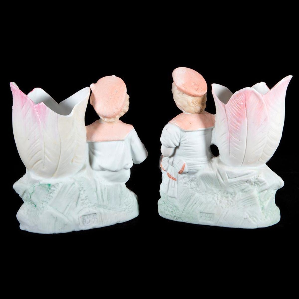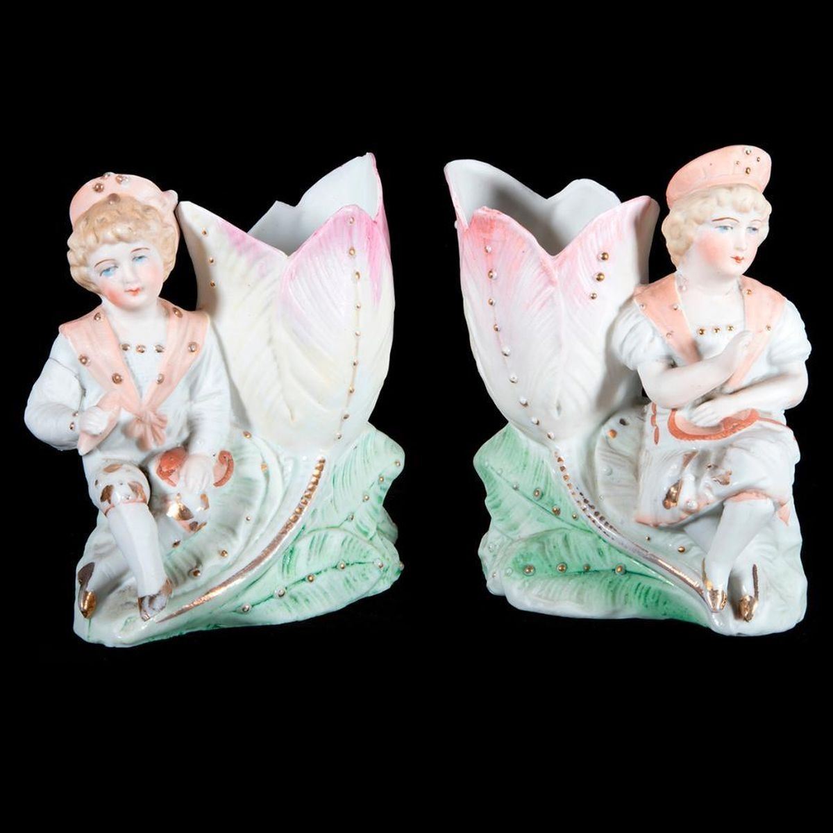A pair of bisque vases with children. H- 5 1/2" W- 4 1/2" D- 2 1/2". Condition: Good.