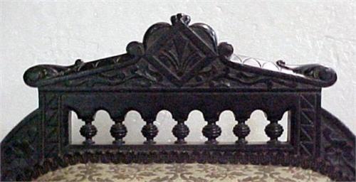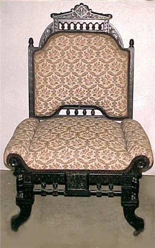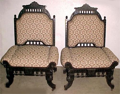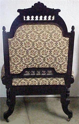 A pair of walnut Victorian and upholstered side chairs; stick and ball decoration below crest and seat rail; beehive finials; on casters; each measures 38" high x 23" across x 18" deep (slight wear on crests). WILL NOT SHIP.