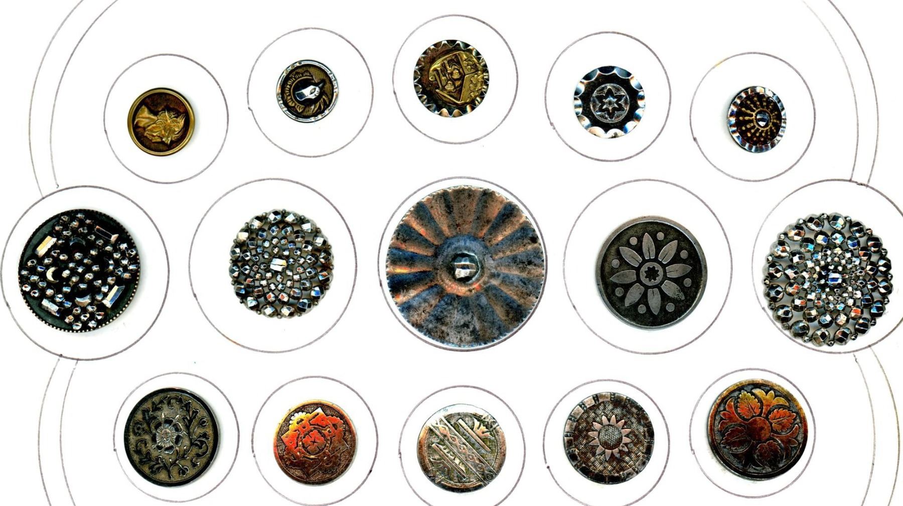A partial card of assorted steel buttons.