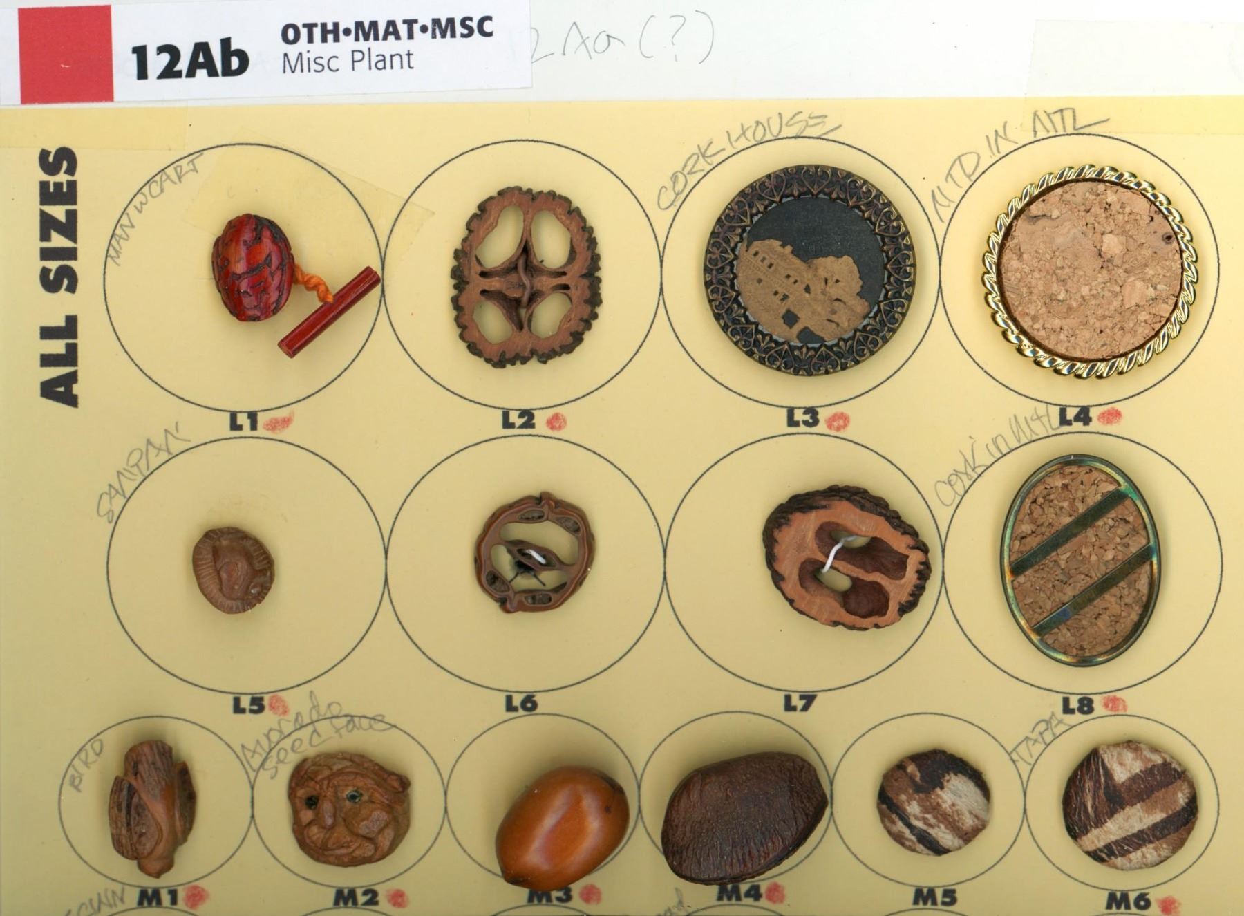 12 S/M/L 19th/20th century examples of cork, seeds and more. Here is a fun card of assorted unusual earthy type materials on buttons including an Avocado seed carved face with glass eyes, a detailed division 1 cork architectural carving in brass with a heart border. Other seed examples and more.