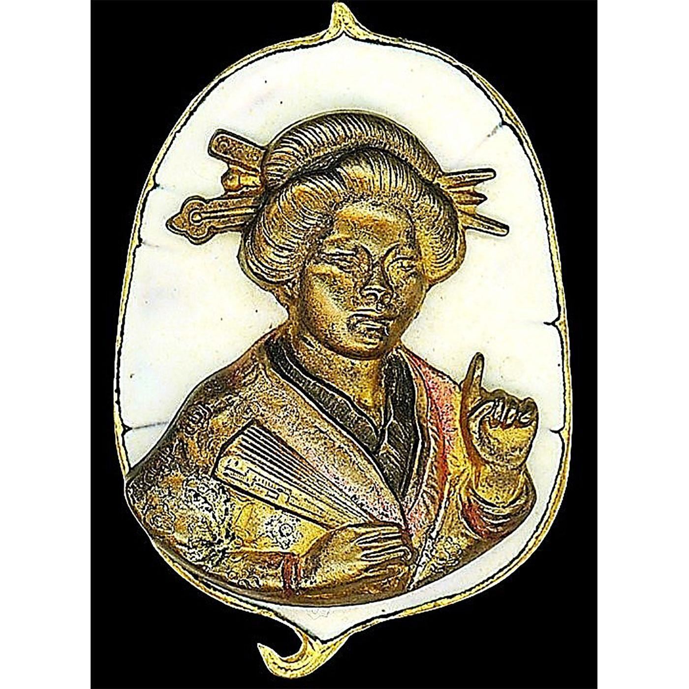 21 S/M/L 19th-20th century assorted material examples. Here we have a nice painting on natural material under glass, a transfer on paper under glass with paste border, a nice handkerchief corner, a scarce Veg Iv. Background Egyptian head steel cup, other natural material, a soft cream colored enamel background high relief Asian female, and more. A great lot!!!