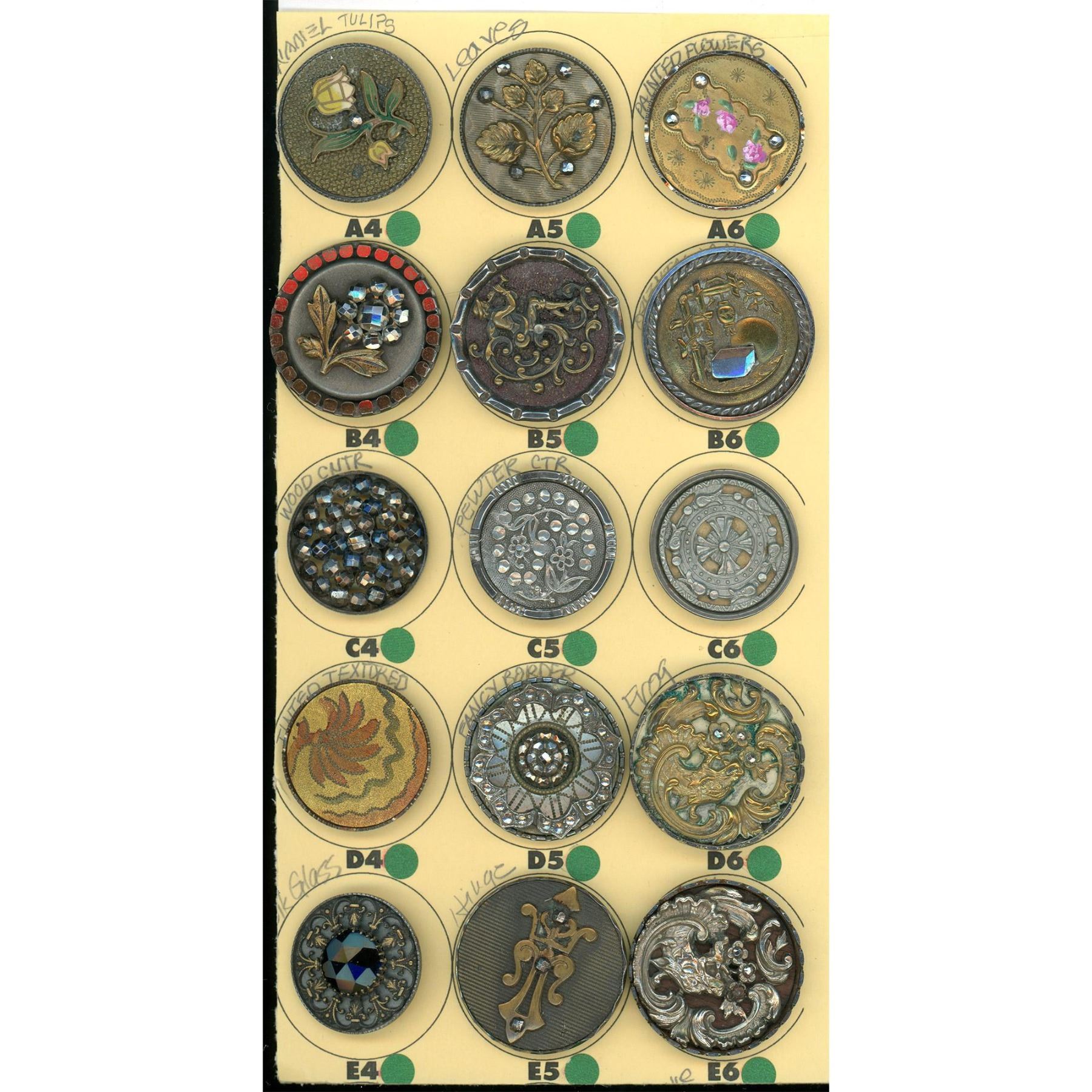 15 Medium/Large 19th C. steel cups including pictorial examples. Here is a nice card of steel cup buttons including a black glass center, enamel floral, paint DF, pictorials and more.