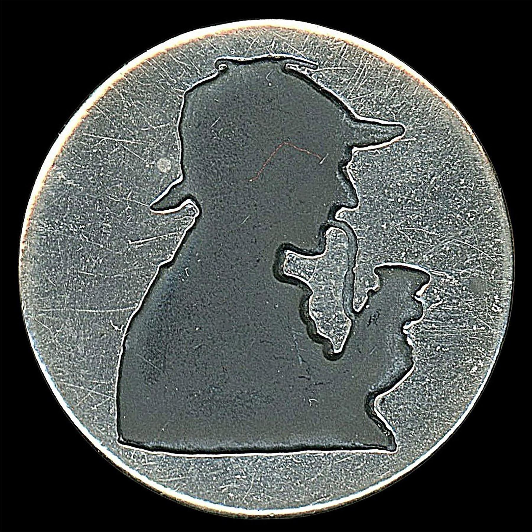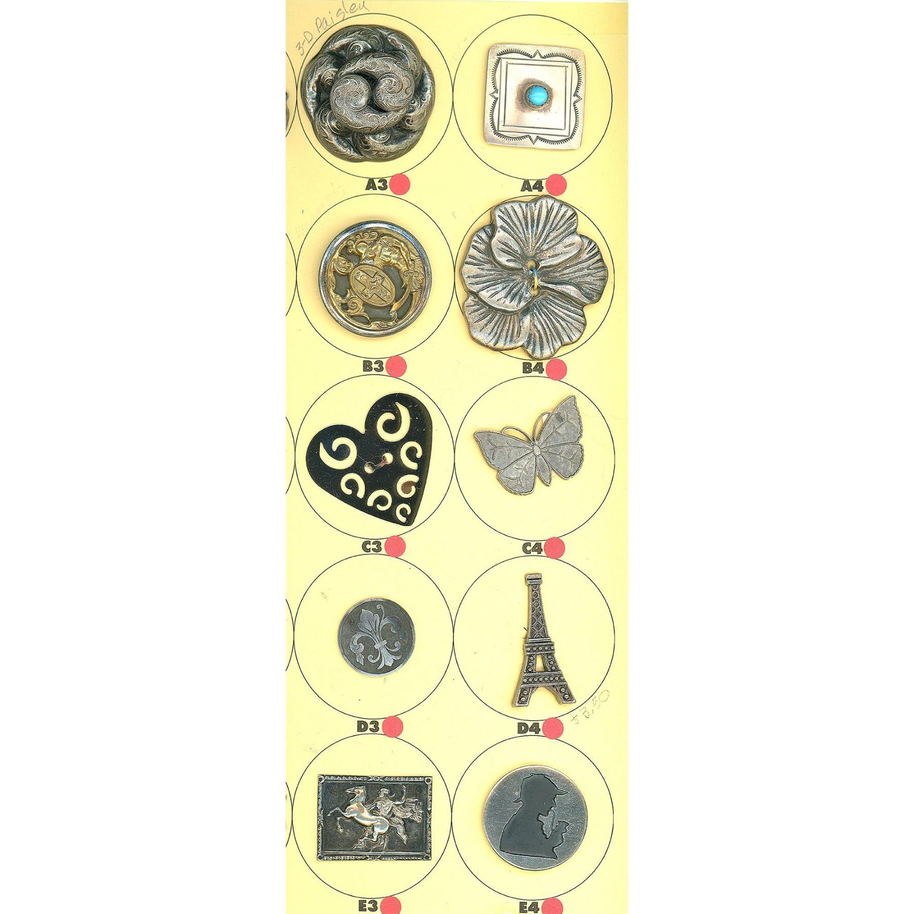 10 Medium/Large 19th-20th century white metal buttons. This nice card includes French whites, a fun silhouette of Sherlock Holmes, silver, a cool square Indian silver with Turquoise, pewter, many pictorials and realistics. A really nice selection.