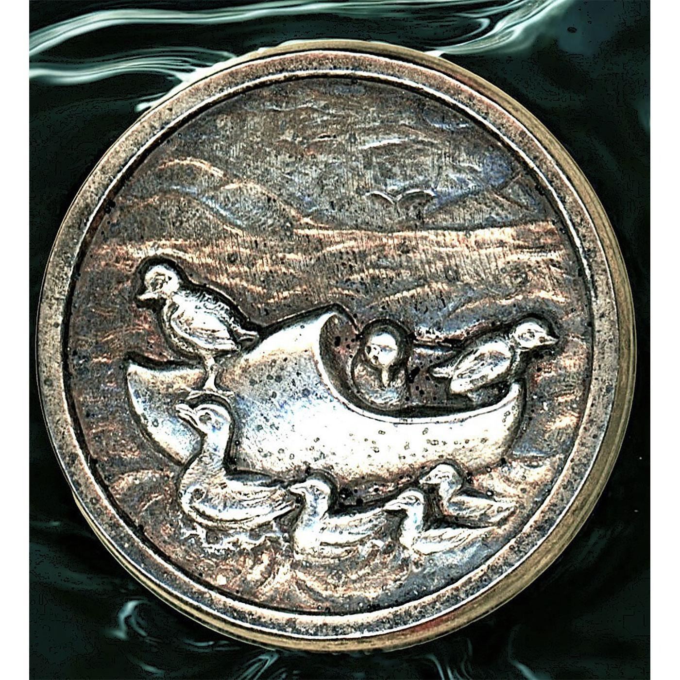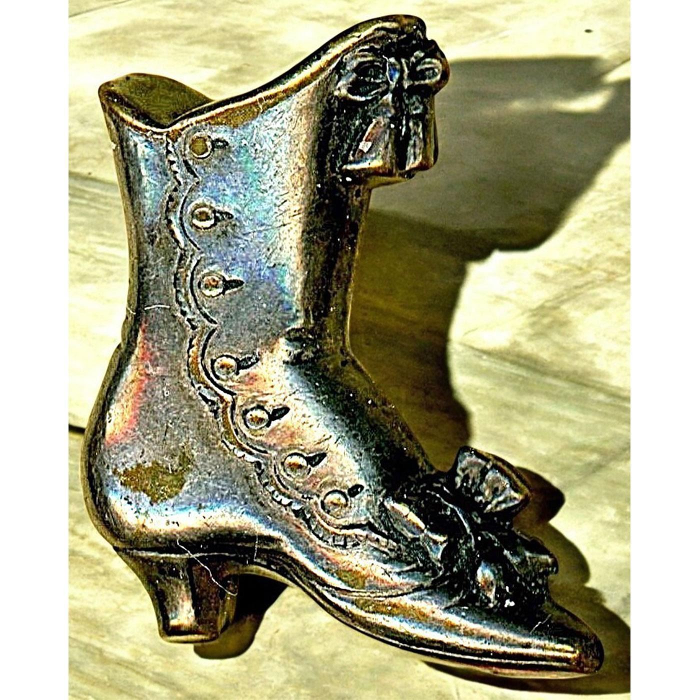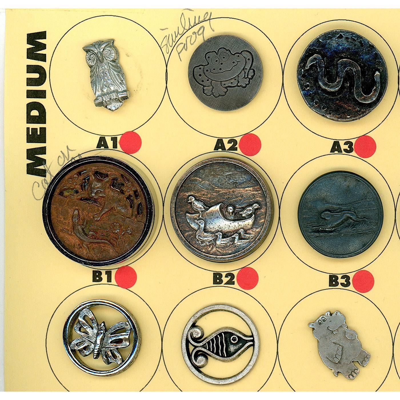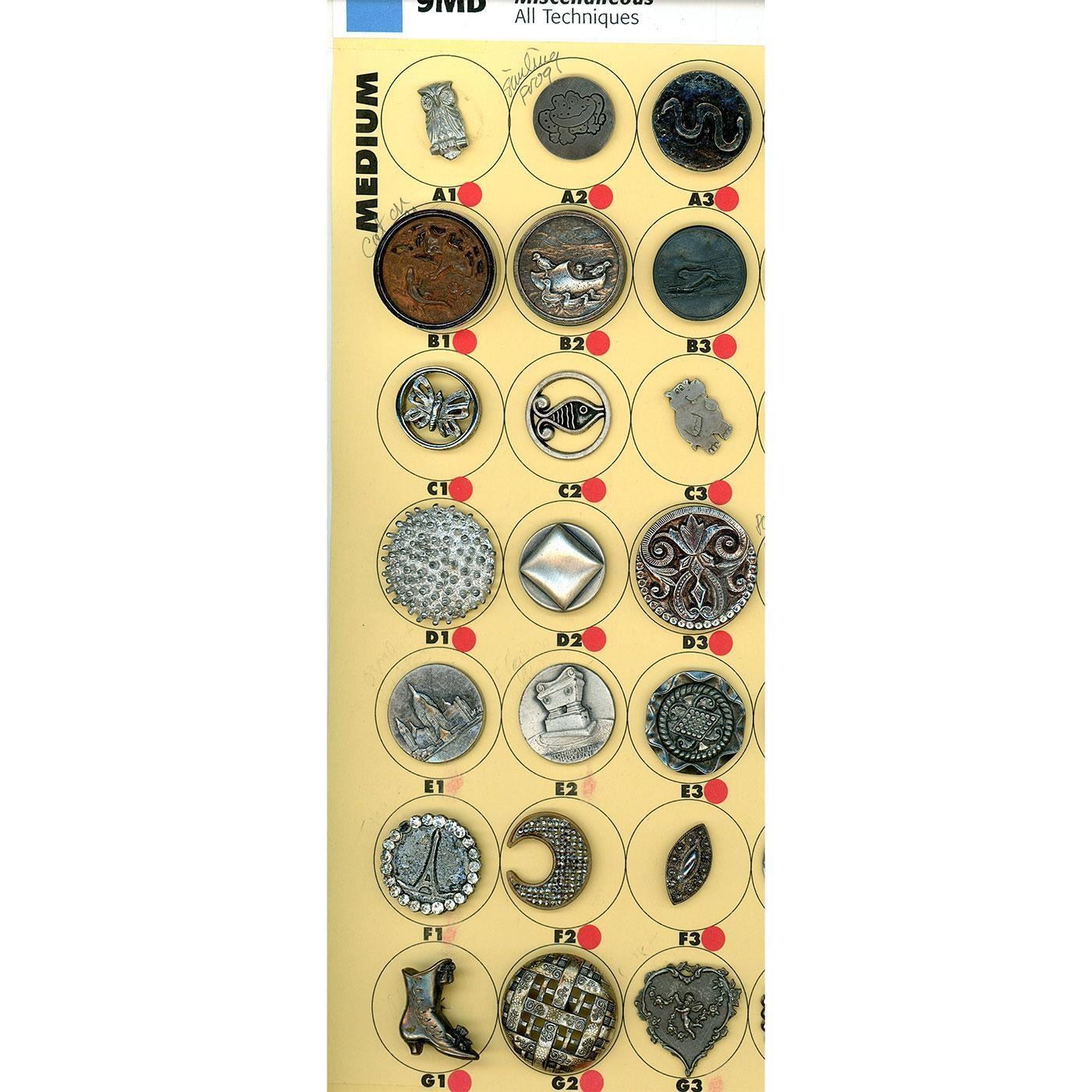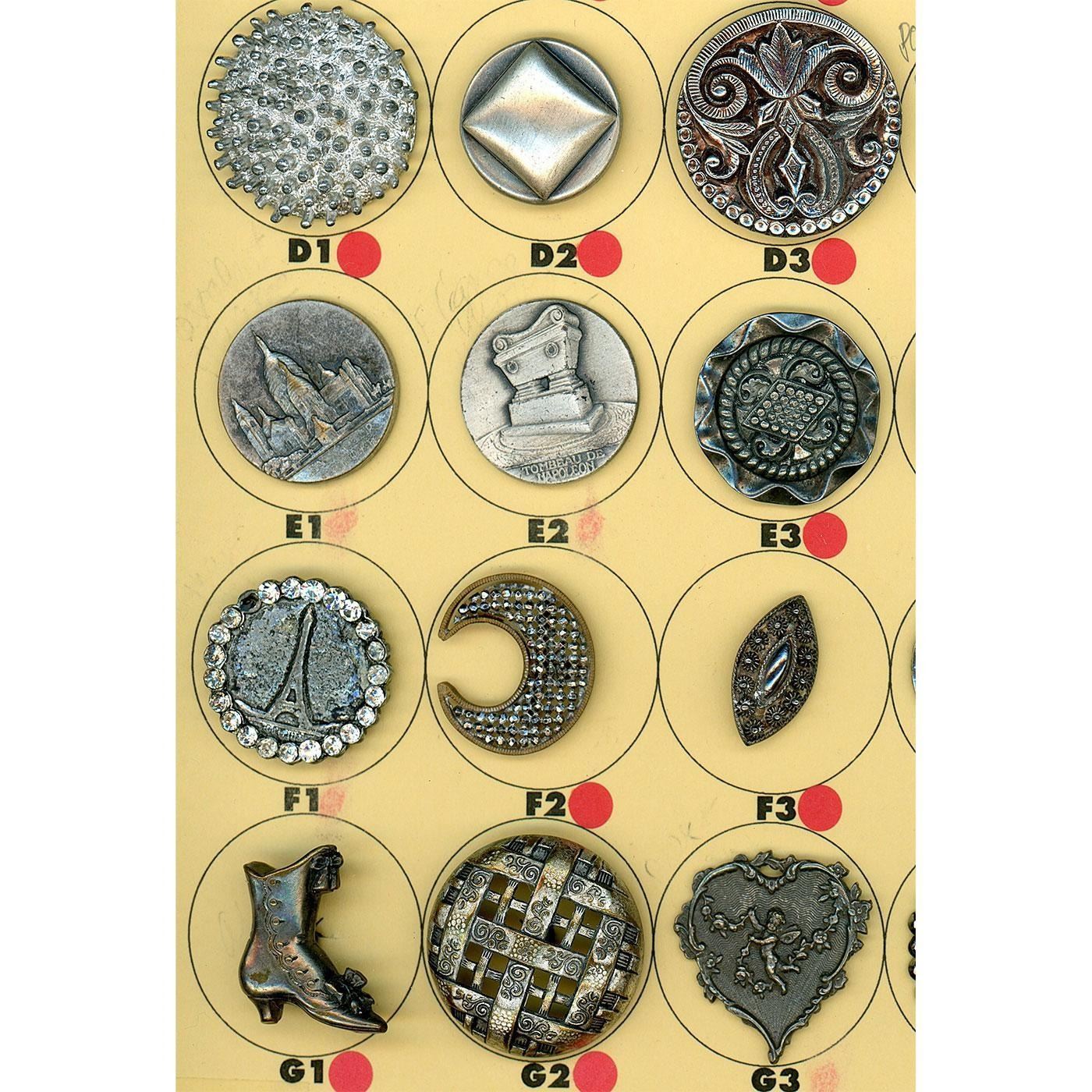 21 Medium 19th-20th C. specialized to white incl. pictorials. This is another cool partial card of buttons and includes some really fun examples that Nikki Deal of Missouri compiled. Take a look at the detailed high button shoe as well as the cute ducks in a sabot and the 19th century brass and riveted all over steel crescent moon. The lot also includes a white metal Eiffel Tower with a paste border, other nice pictorials and patterns. Great selection.