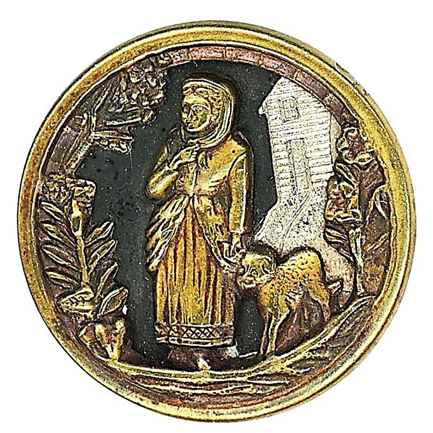 20 S/M/L 19th century assorted metal including Mary & Her Lamb. This card of story buttons includes the rare picture button of Mary and Her Lamb along with Hooking a Snail, Polling Down the Mississippi, Buster Brown, Riding a paper cock horse and much more.