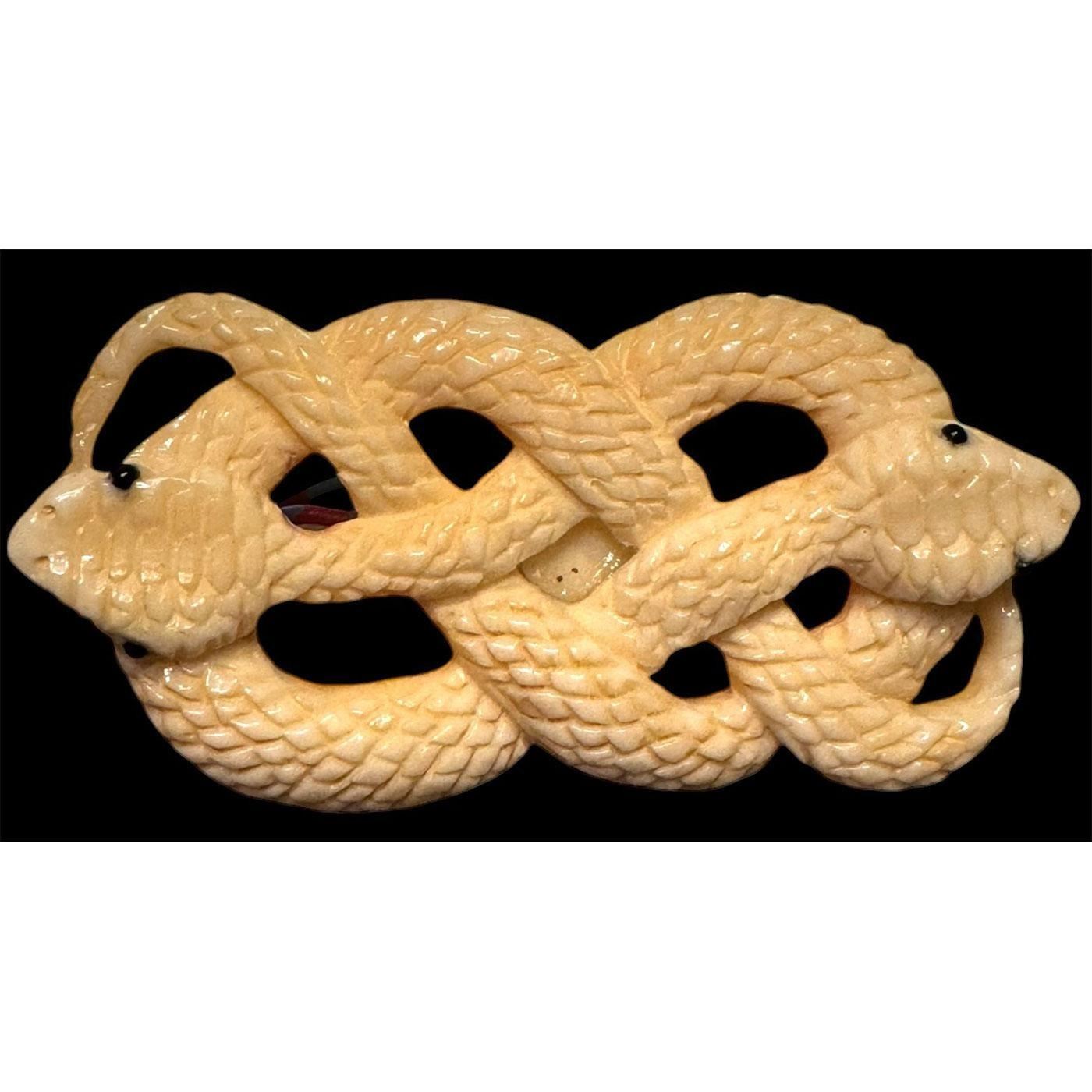 17 S/M/L 19th-20th century assorted material examples. This card of snakes includes realistics and other shapes. Materials include ceramic, bone, copper, a scarce Japanese Satsuma, silver, glass, brass, a cool beaded example, and more.