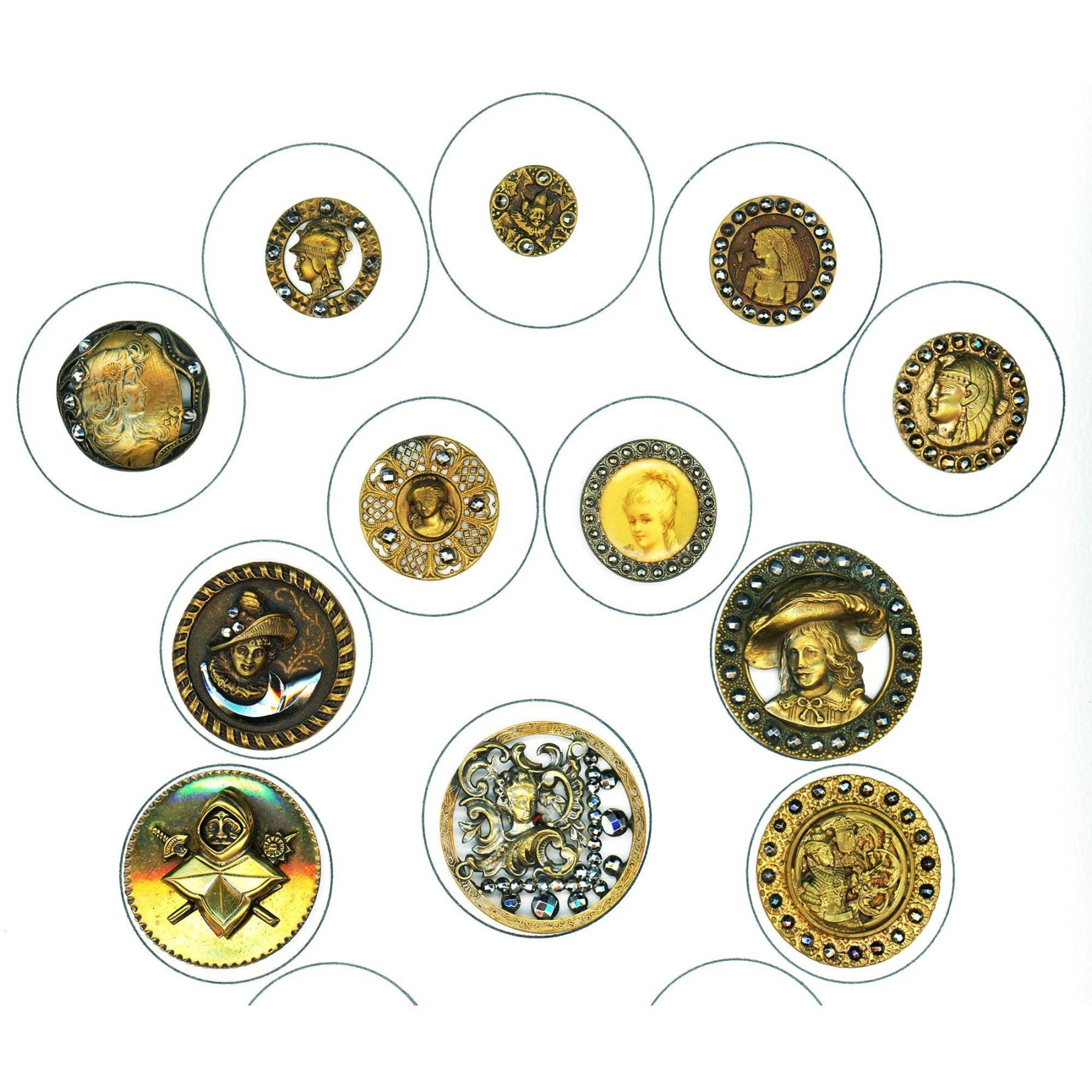 12 S/M/L 19th century specialized to mostly metal. The buttons on this partial card have things in common, one that they are all head buttons, the other is they all have cut steel OME, Several are pierced, some have shaped cut steels and one is a litho under celluloid shield, Nice selection including some extremely detailed examples.