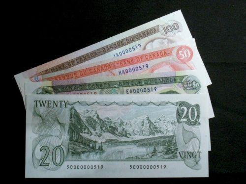 A partial multi-colour match set. All with serial number:#0000519. Includes BC-54a 1979 $20, BC-50a 1969 $20, BC-51a 1975 $50 and BC-52a 1975 $100. AU-UNC
