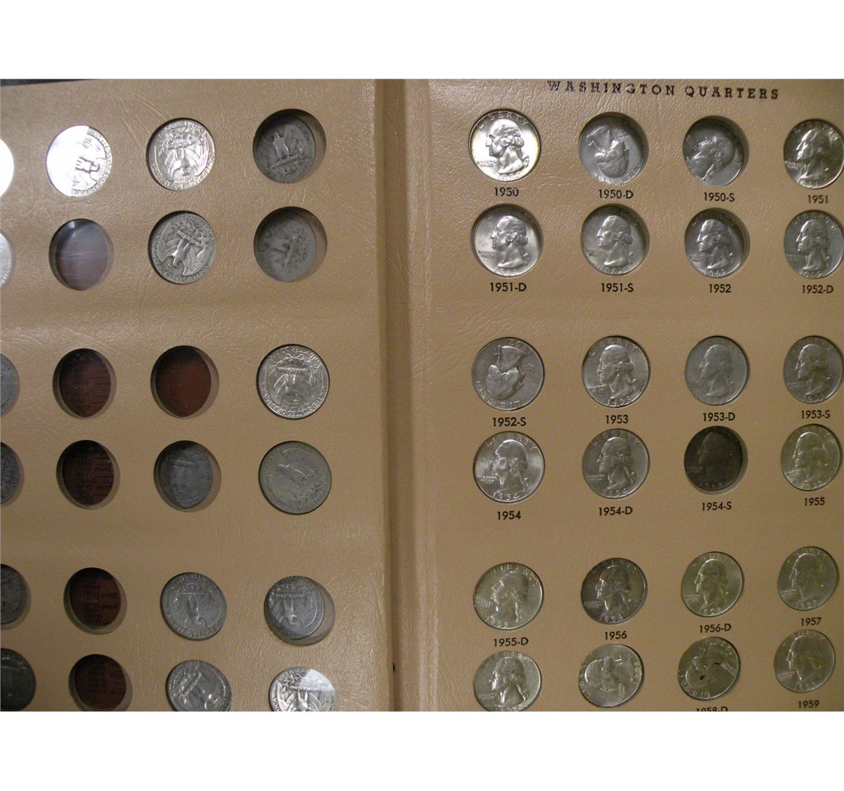 A partial set of Washington Quarters (1932- 1998). Missing many of the earlier dates, but entirely complete from 1955 through 1998 except for the 1995-S (does not include the silver proofs in the 1990's). A total of 146 coins, 51 of which are 90% silver and 2 of which are 40% silver. Est$220