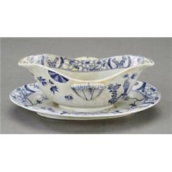 A pearlware double-lipped sauceboat, fixed stand and scrolled feather handles, printed with Chinese flowers of the seasons in blue, 10in wide