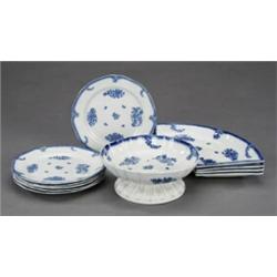 A pearlware part supper service, printed with flower sprays and sprigs in blue, comprising pedestal dish, four segmental dishes and six plates, 7.75in diam