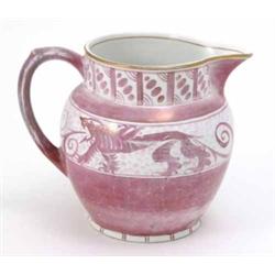 A pink lustreware jug, decorated with bands of stylised dragons and geometric patterns, 6ins £100-150