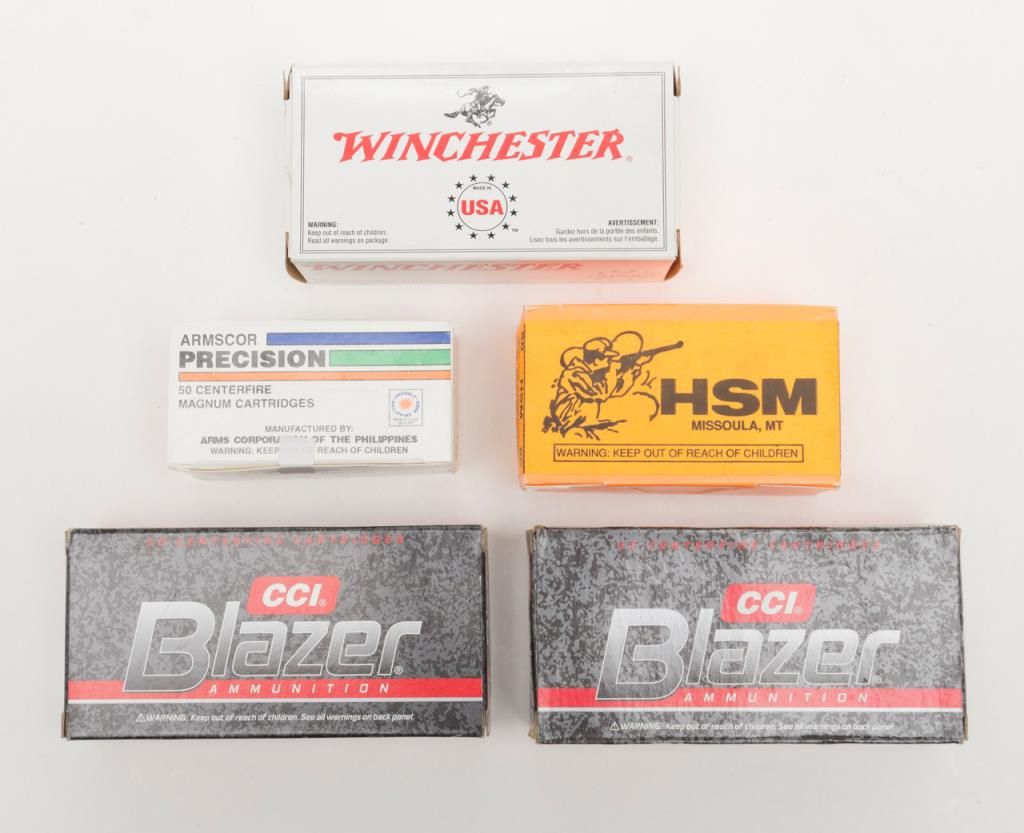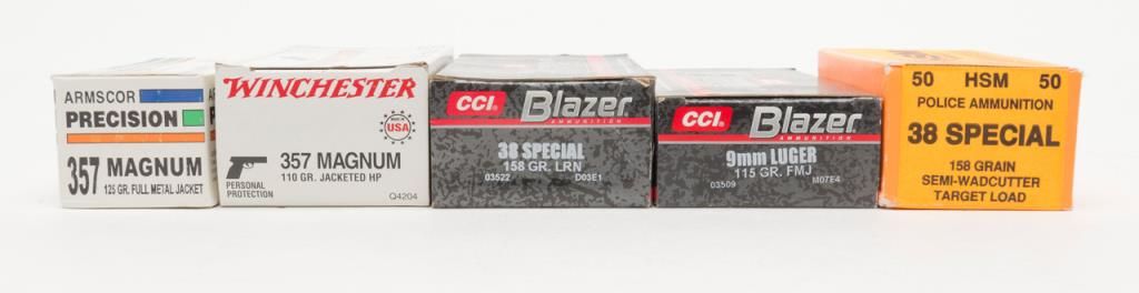 A pistol shooters lot of ammunition consisting two boxes of commercially manufactured .38 Special rounds and two boxes of .357 Magnum rounds and a box of 9mm Luger for a total of 250 rounds. Est.: $100-$200.