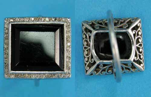 A platinum Art Deco ring, set with a rectangular cut onyx within a border of small diamonds £150-200