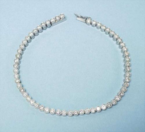 A platinum and diamond line bracelet designed as a sequence of fine collette set diamonds, total approx. weight 3.50 cts. 4000-4500