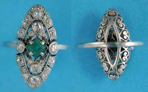 A platinum, emerald and diamond marquise shaped cluster ring, set with a central square emerald and round-cut diamonds £250-350