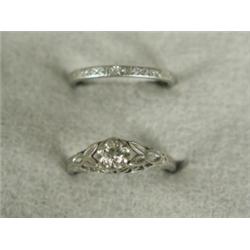 A platinum mounted diamond solitaire ring within pierced and engraved shoulders and engraved shank, with matching wedding band, size L 1/2 Est. 200/300