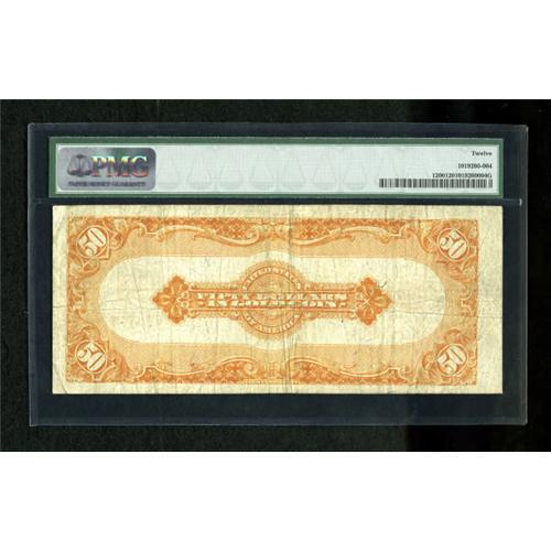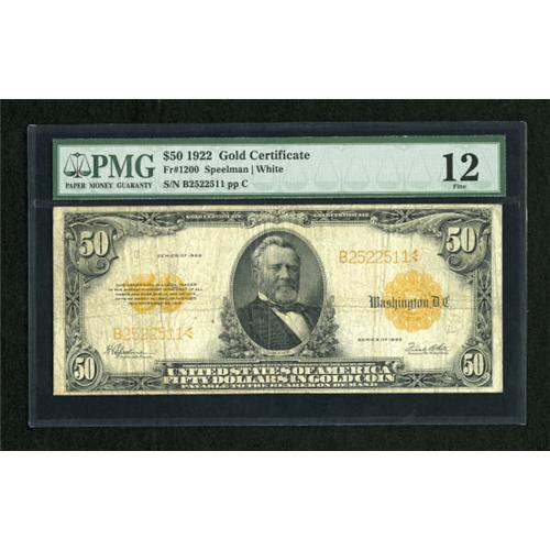 <B>Fr. 1200 $50 1922 Gold Certificate PMG Fine 12.</B></I> A popular type with this example sporting sound edges and a couple of pinholes and an approximate quarter inch internal tear.<BR><BR><b>Shipping:</b> Coins & Currency (<a target="_blank" href="http://www.heritageauctions.com/common/shipping.php">view shipping information</a>)