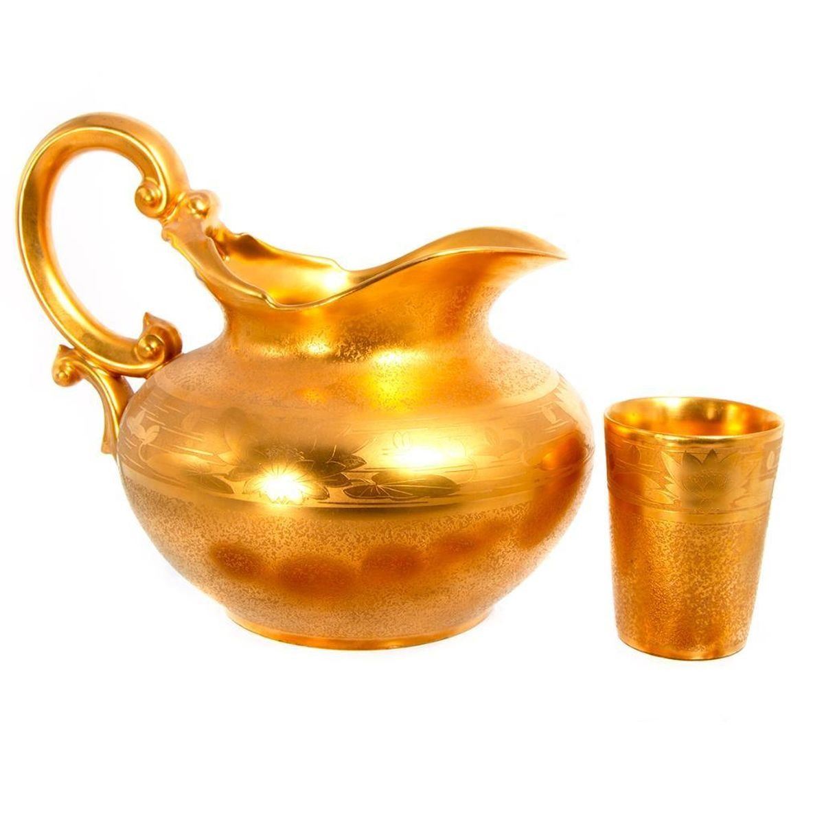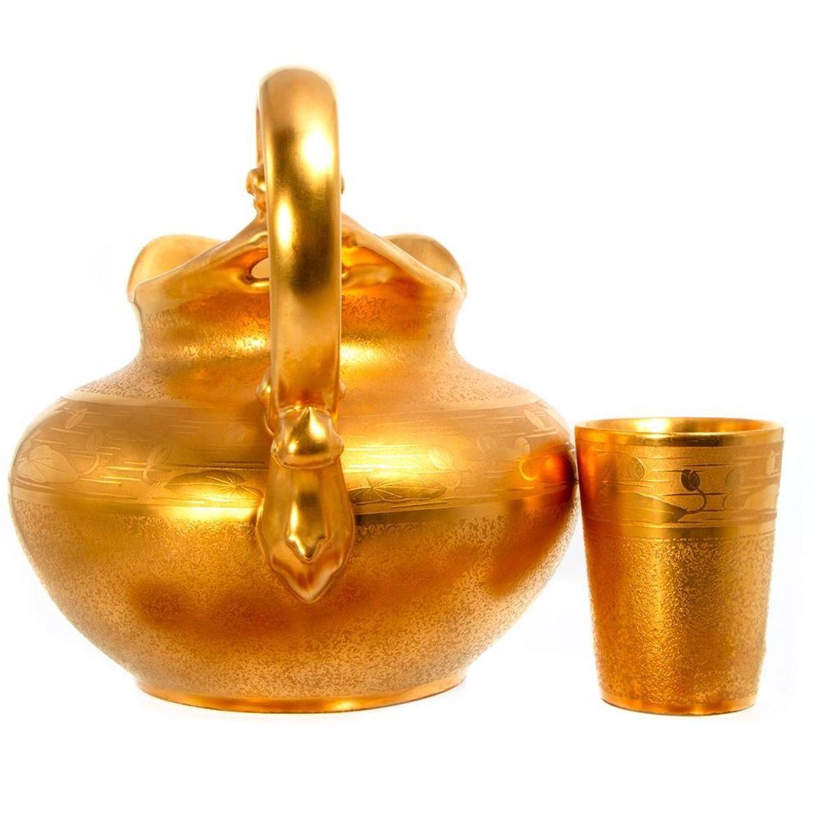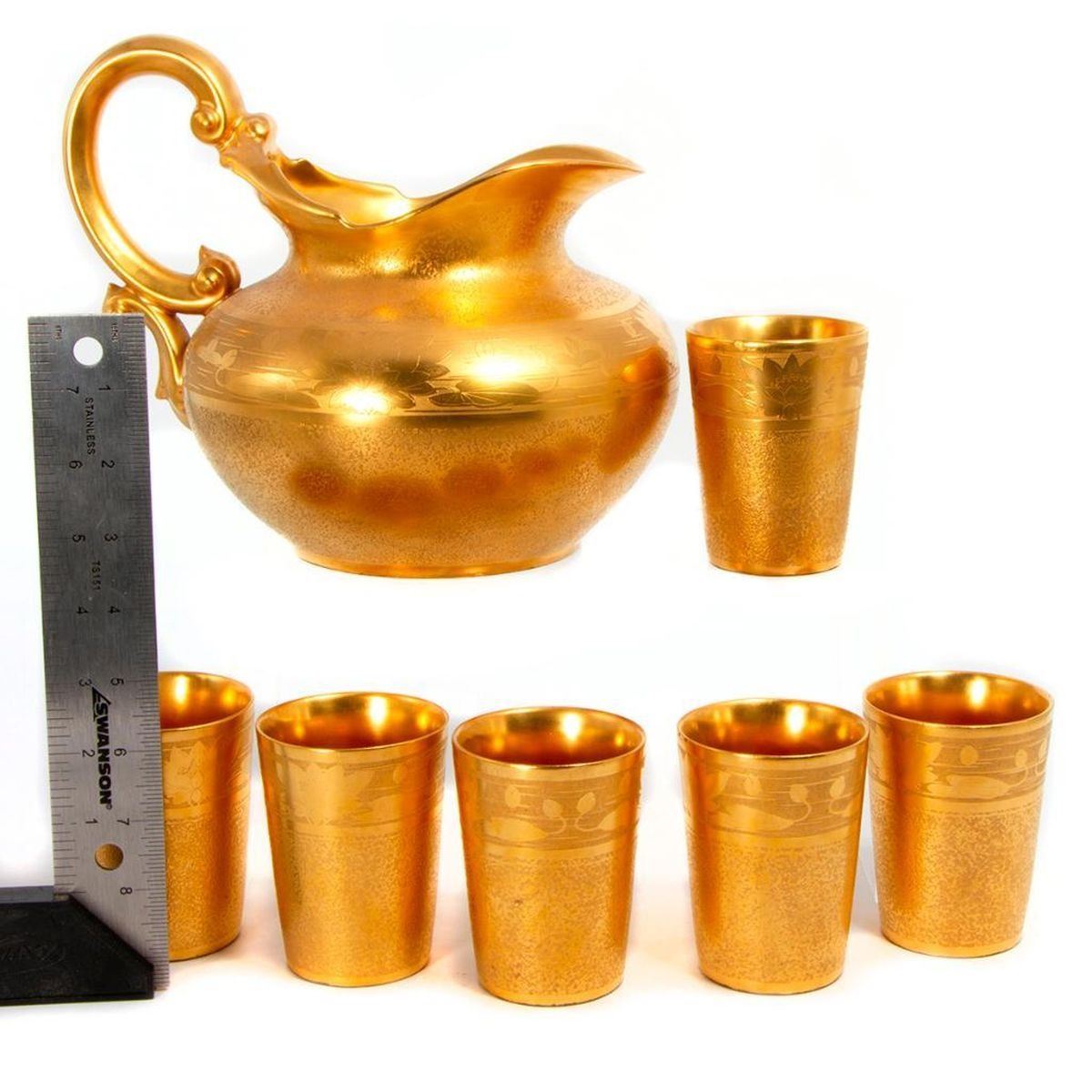 A 24-carat gold decorated Dart porcelain lemonade pitcher and six glasses signed Osborne. Pitcher - H- 8" W- 7 1/2" D- 10". Glasses - H- 3 1/2" Dia. 2 3/4". Condition: Good, small repaired rim chip to one glass.