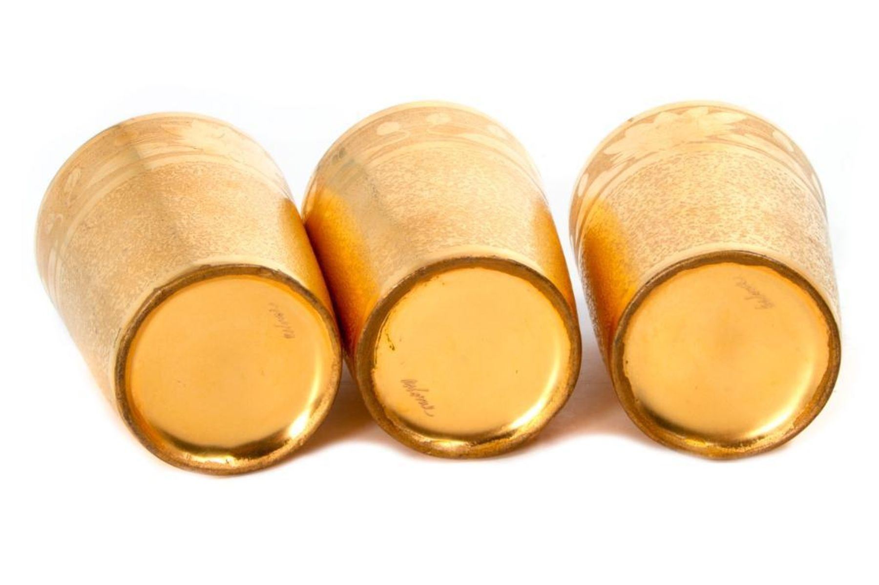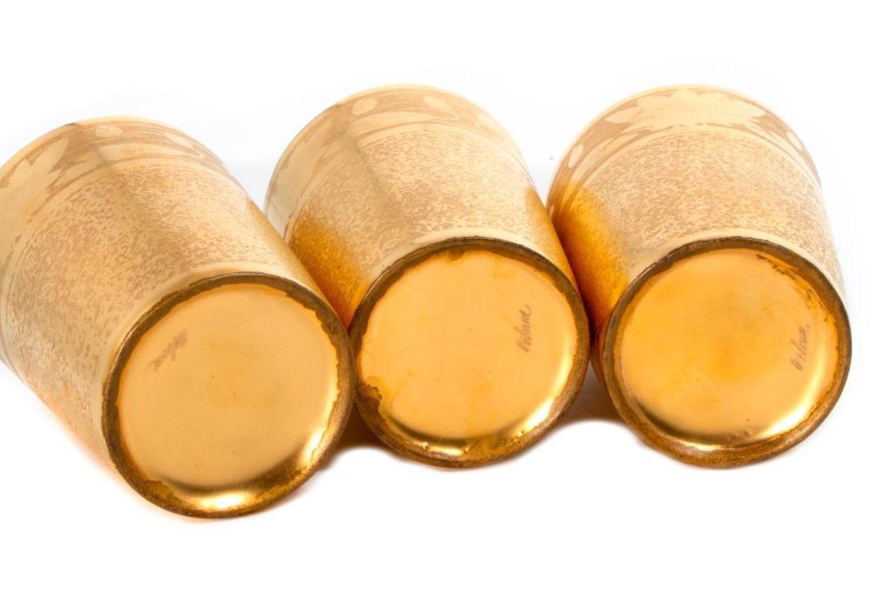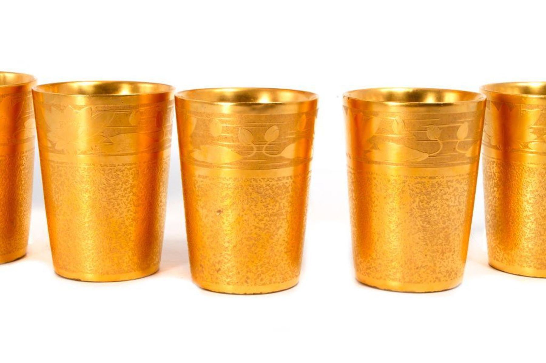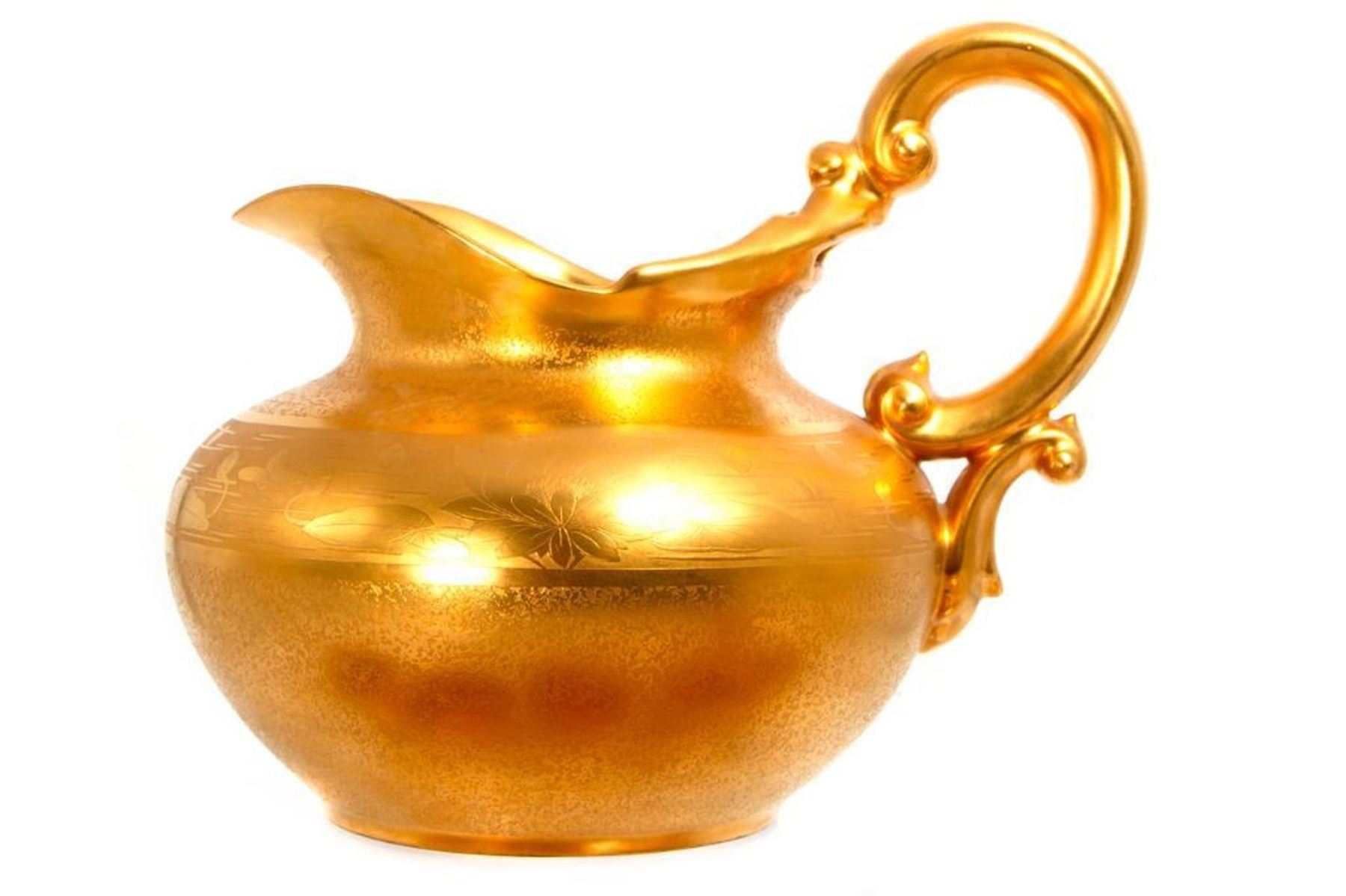 A 24-carat gold decorated Dart porcelain lemonade pitcher and six glasses signed Osborne. Pitcher - H- 8" W- 7 1/2" D- 10". Glasses - H- 3 1/2" Dia. 2 3/4". Condition: Good, small repaired rim chip to one glass.