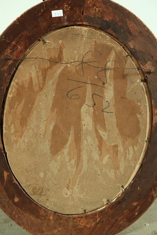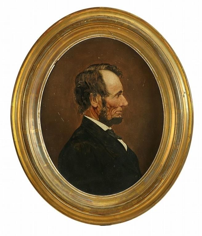 A portrait of Lincoln. Oil on paper, unsigned. In a gilt oval frame, 19inh. 15.5inw.