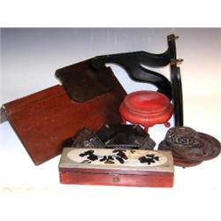 A quantity of folding brackets, Chinese and other stands etc., to include an ebonised clock bracket, two mahogany folding brackets, Chinese red lacquer stand etc (a quantity) £50-70