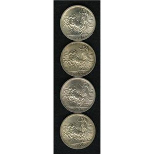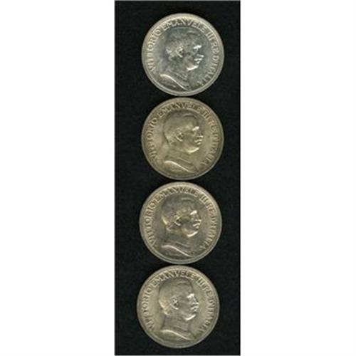 <B>A quartet of brilliant 2 Lire including:</B></I> 1914, bright and lustrous UNC with minor handling marks; 1915, superb original toning and Choice UNC; 1915, light golden toning and near-Choice UNC; and a 1916, fully original UNC. An absolutely original group that has been with the same collector for many years.