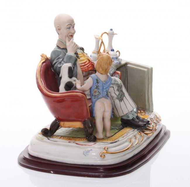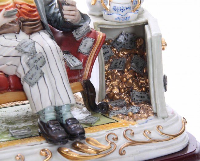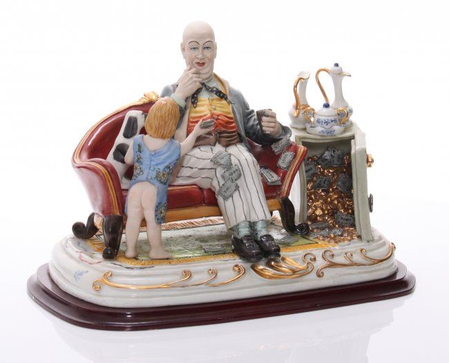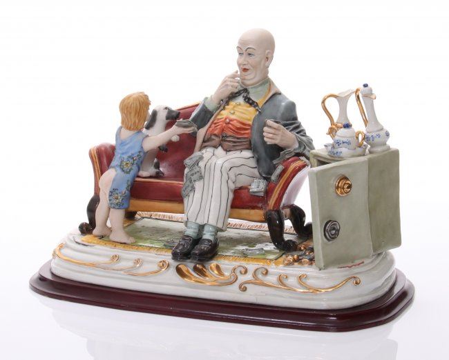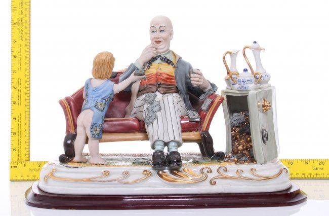 A rare Capodimonte Deposee, Italian porcelain depicting a small child with Rich Grandpa and his dog sitting on a couch with an open bank safe full of cash and coins. Markings: "Work of Art N (crown) Italy", "Capodimonte Deposee" SIZE: see attached ruler photo. Photos are part of the description representing the condition report and can be used for authentication prior to the sale date. Pangaea Auctions urges Bidder's to view all attached photos in detail.