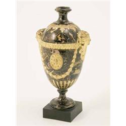 A rare James Neale & Co., Hanley marbled urn, circa 1776-86, neo-classical style with gilded female portrait busts, harebell swags and acanthus borders modelled against the brown-marbled ground, on square black basalt plinth, moulded mark, 9.75in. £200-300