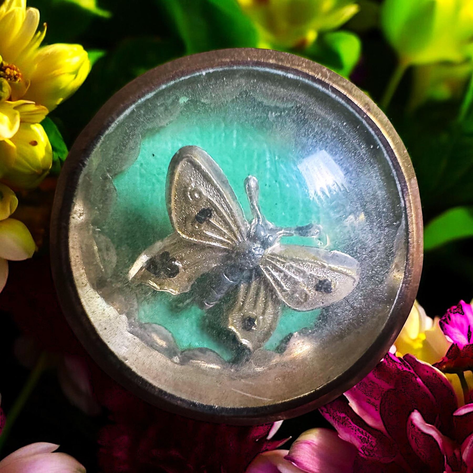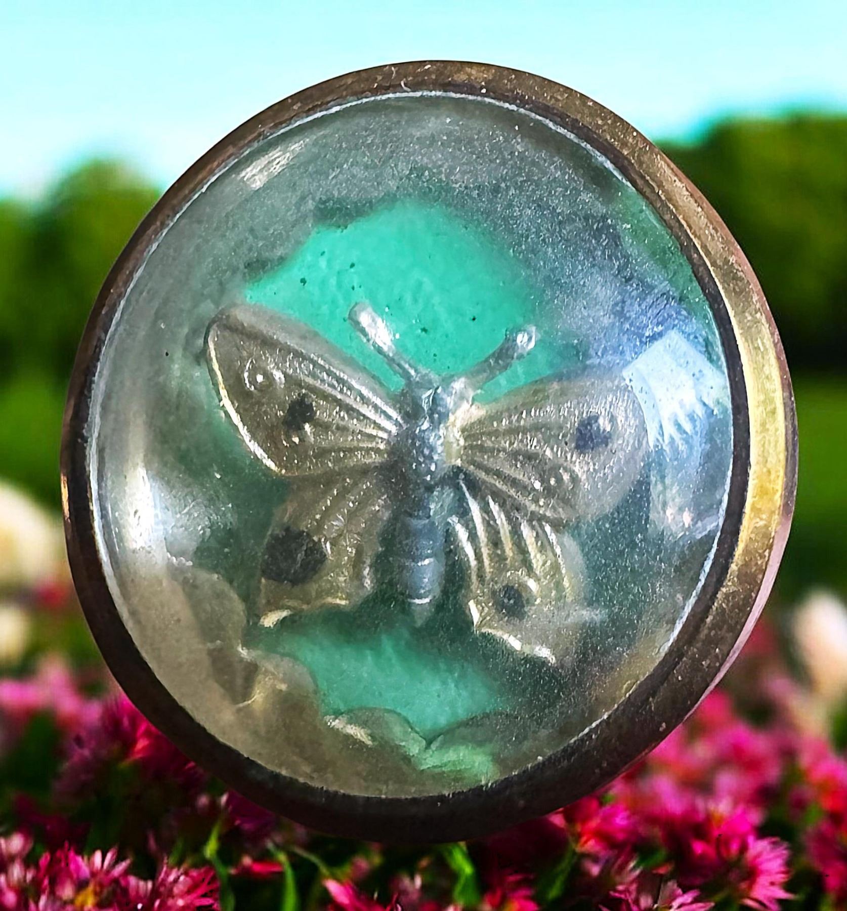1 Medium size 19th century under glass butterfly example. As seen in the video attached this butterfly is a trembler stud button as you can see the Butterfly moves around when the stud button is shaken. Very cool and very hard to find. Often you might find the dancing doll but this butterfly is quite scarce.