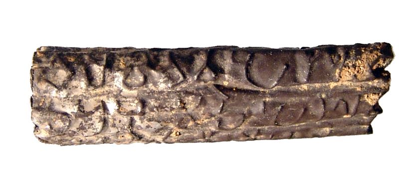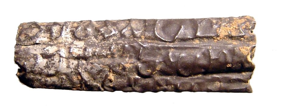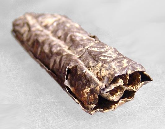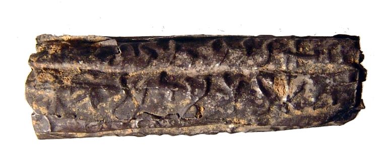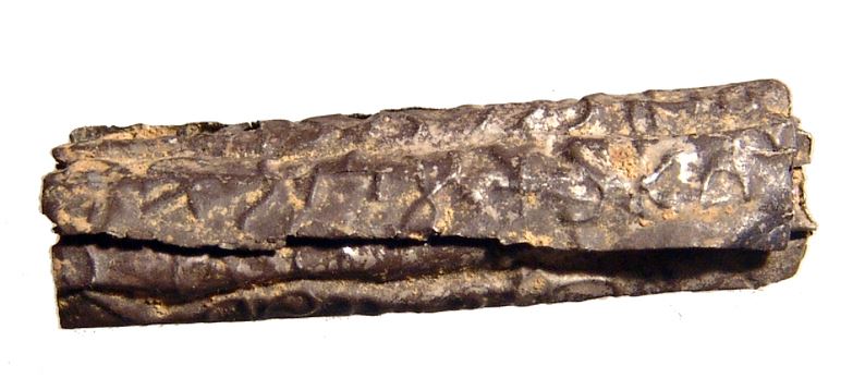 A rare silver scroll from the Holy Land, c. 7th - 4th Century BC, well-preserved with Aramaic text visible on all the visible surfaces. L: 1 7/16 in (3.6 cm). Intact and attractively toned. Ex Los Angeles private collection.