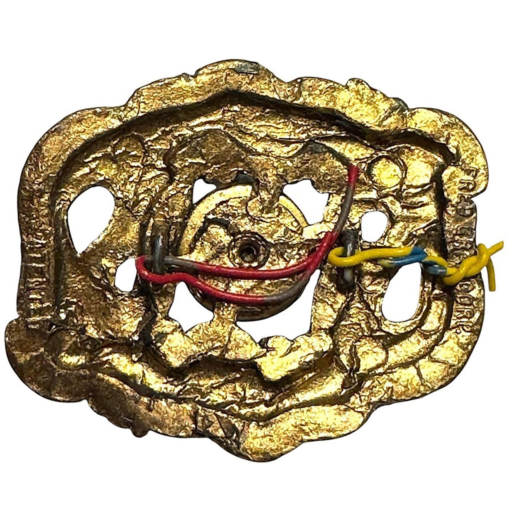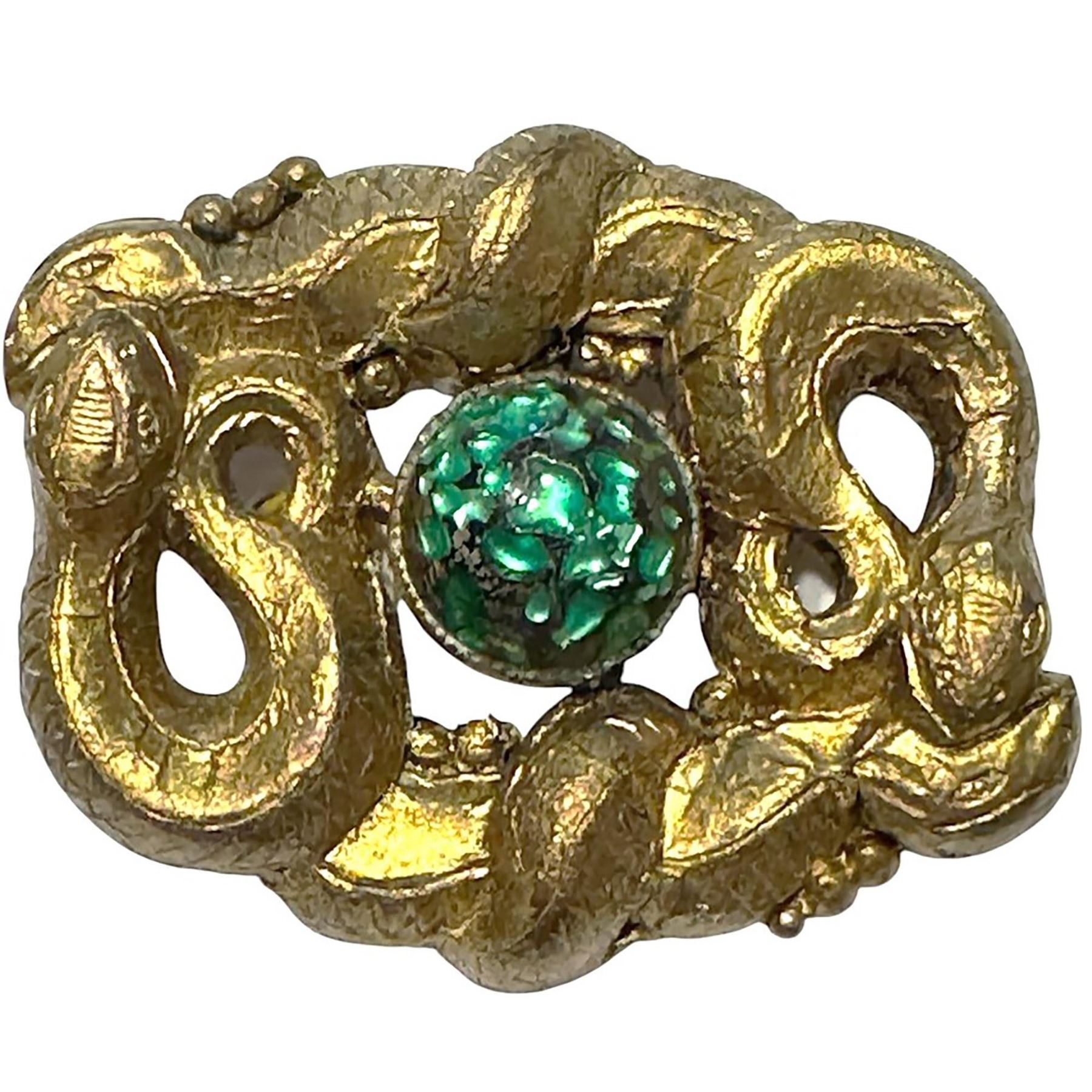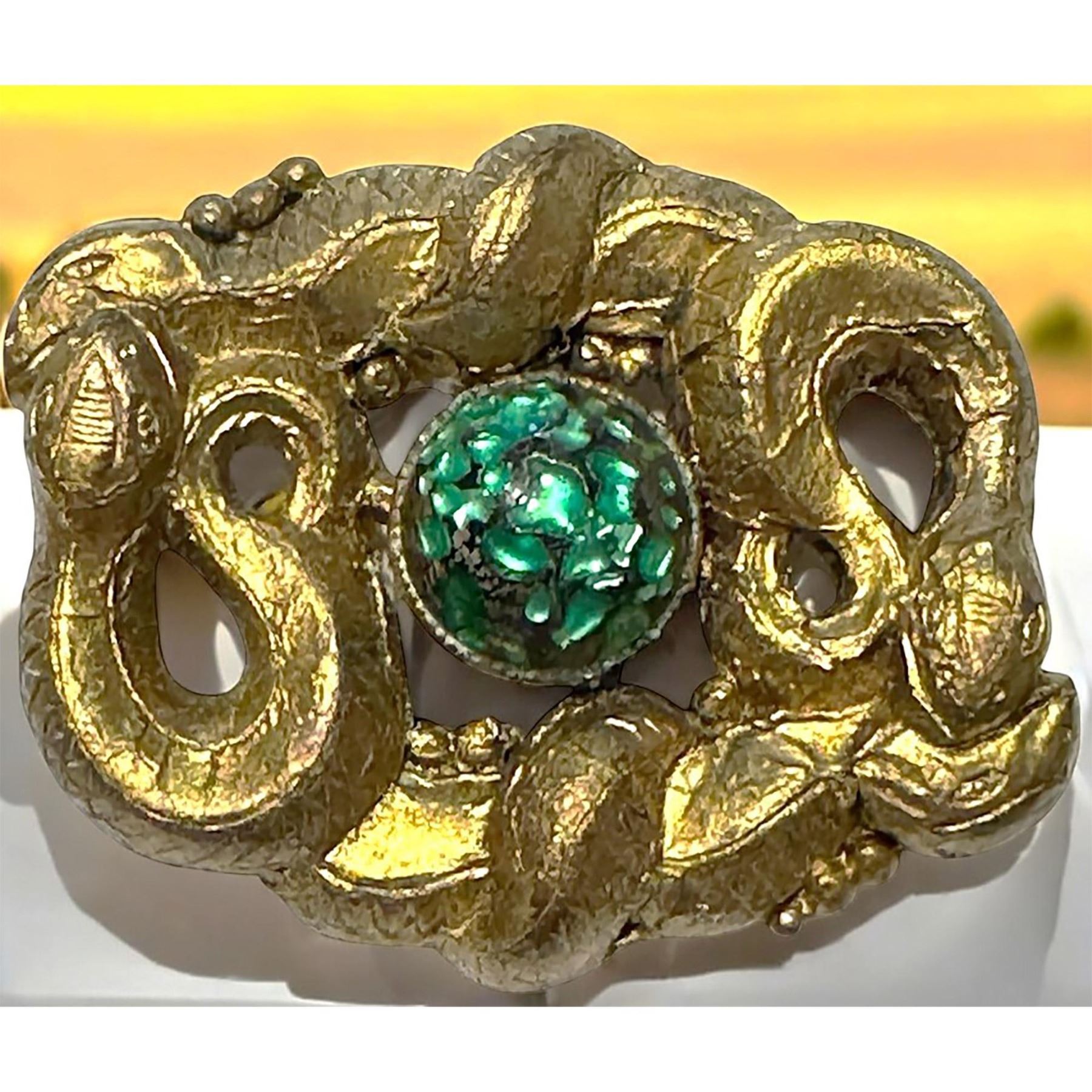 1 Large 20th century button by the Fred Gray Company. This multiple coiled jeweled snake button is backmarked with the makers name and patent mark as well. Two shanks but close together to indicate it is a useable button not trim.?A couple of years we sold the same button in our auction and it brought considerably higher $$ than our high estimate here. A great and wonderfully detailed button.