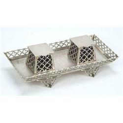 A rectangular inkstand with a shaped gallery and two ink well frames pierced with quatrefoils on openwork feet, London 1903 by George Fox, 19.5cm (7.75 in), 476g (15.25 oz) gross