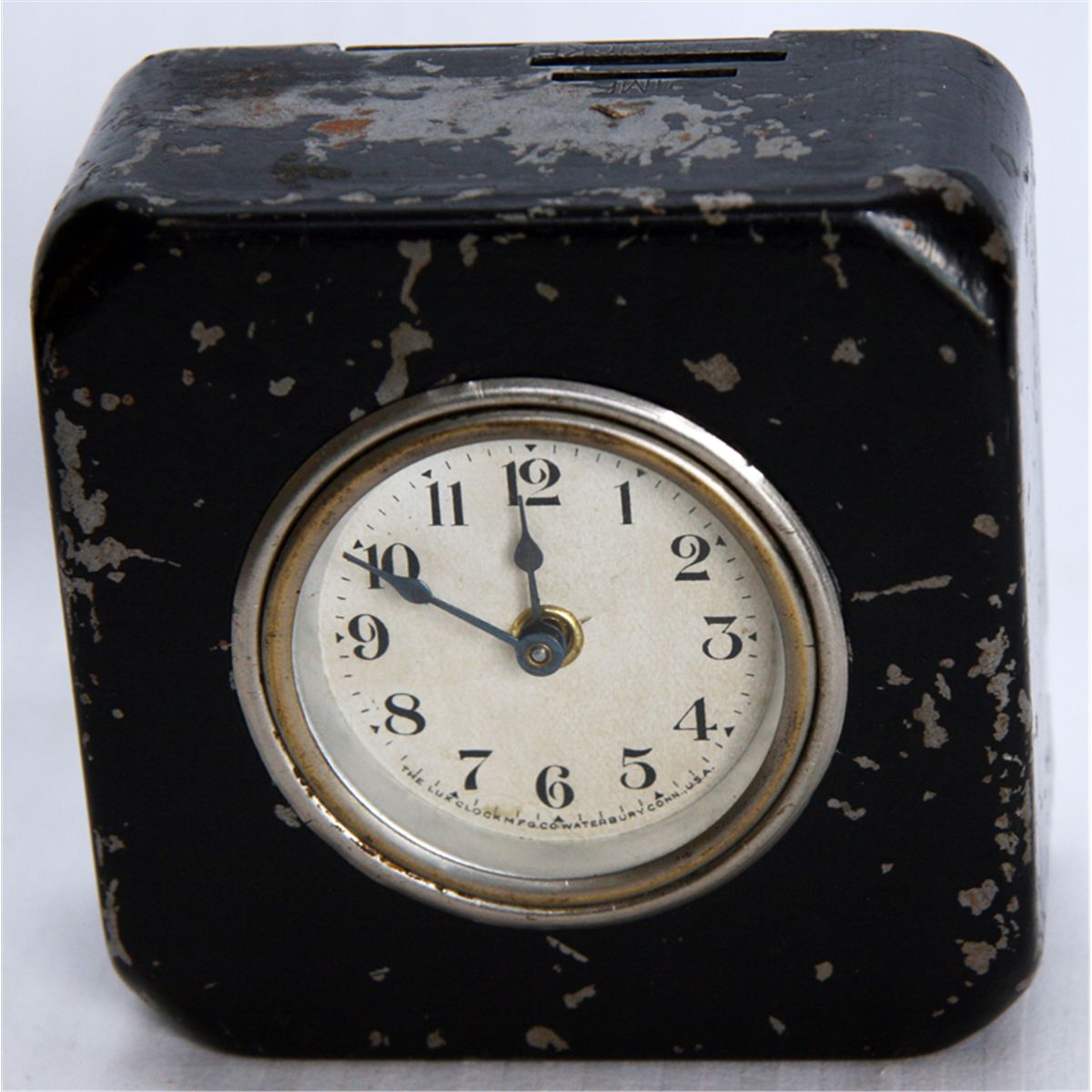 A rectangular shaped Clock Bank. Two coin slots on top. 9 1/2cm x 4cm x 9 1/2cm. Steel, with a black finish. VG/Fine.