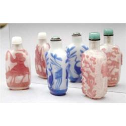 A red overlay snowstorm ground glass rounded rectangular snuff bottle, with equestrian figures, 2.25ins (chipped); a blue overlay white ground glass rectangular bottle with geese and lotus, 2.5ins; and a red overlay snowstorm ground glass rectangular bottle with animals beneath trees, 2.5ins (chipped), 19/20th century, stoppers (3) £70-100
