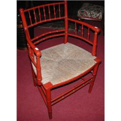 A red painted faux bamboo open armchair, the spindle back above a double rail, bowed arms and reeded seat, standing on circular section legs united with a double stretcher £100-150