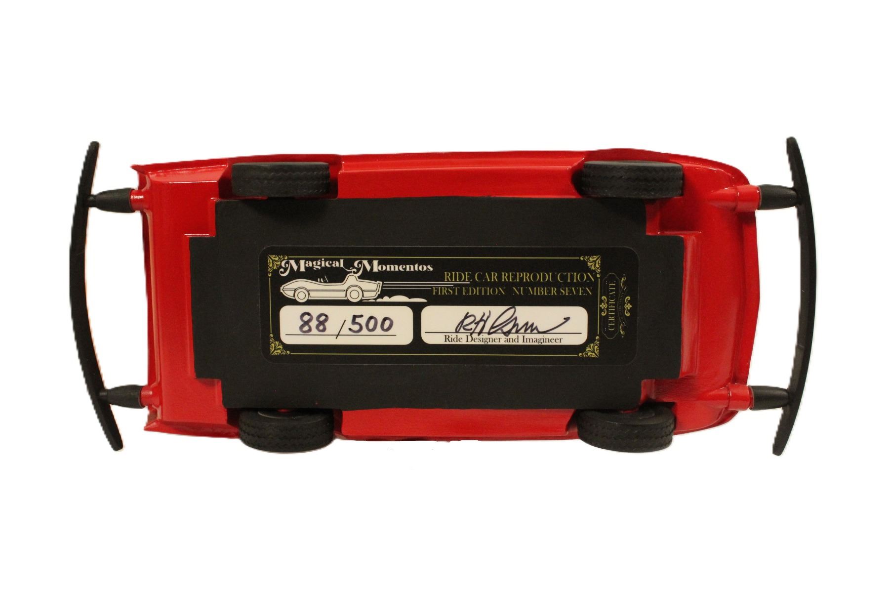 This is a Magical Momentos small scale replica of the Autopia Mark VII attraction ride vehicle used at the Disneyland from 1967 to 1999. It is limited edition #88 of 500, comes new in box, and is autographed on the bottom by Disney Legend Bob Gurr! A COA or LOA can be provided by Signature COA of Orlando for an additional fee.