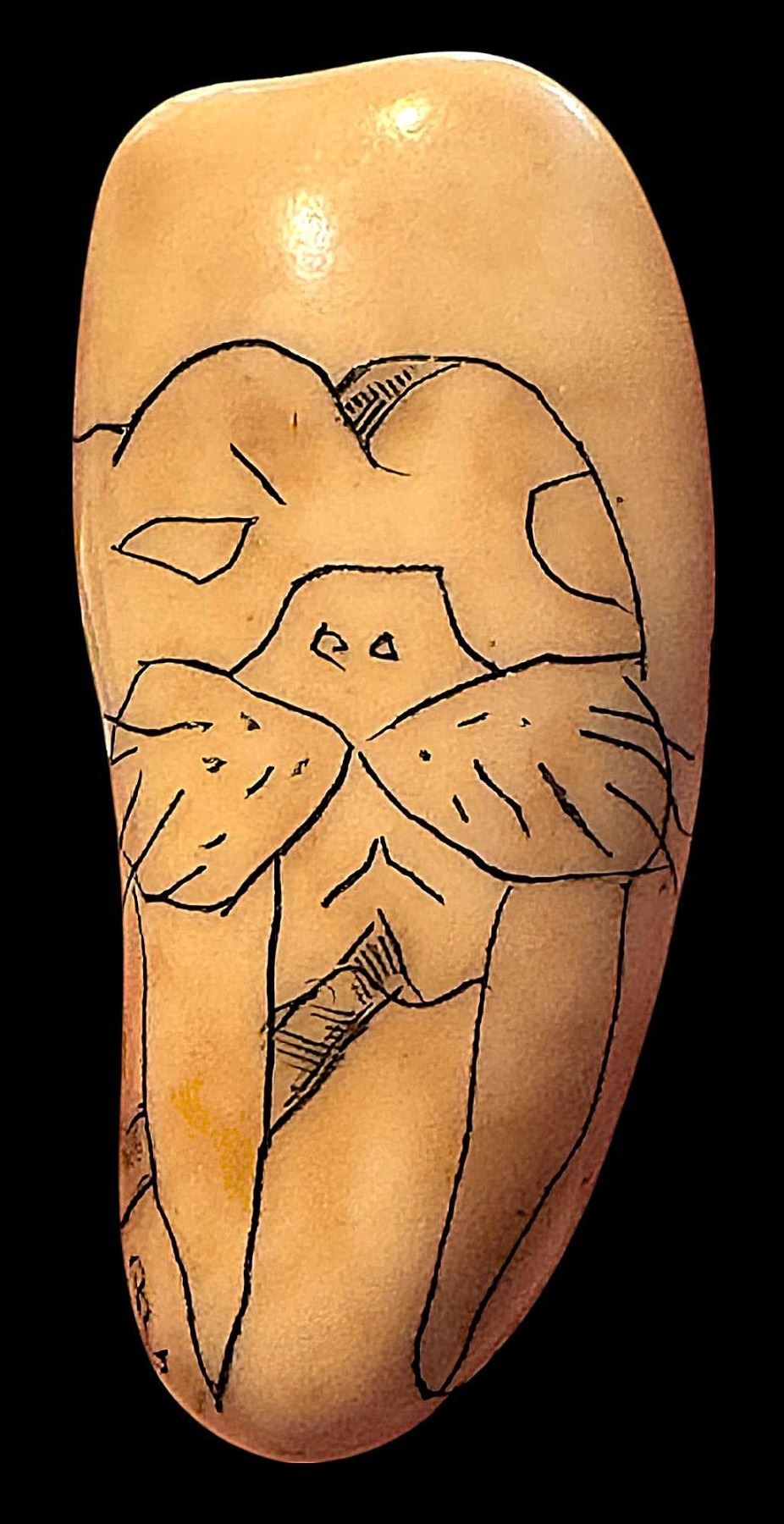 1 Large 19th century pigmented walrus example. This scarce example was engraved with a Walrus pictorial and pigmented with black all on an Inuit tooth shaped base. Often buttons like this are carved with a Walrus or seal but infrequently are they engraved like this one is.