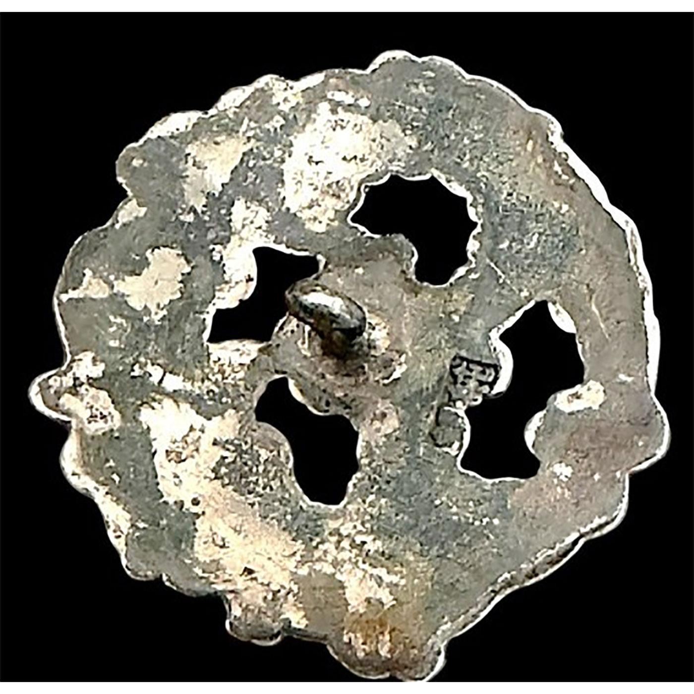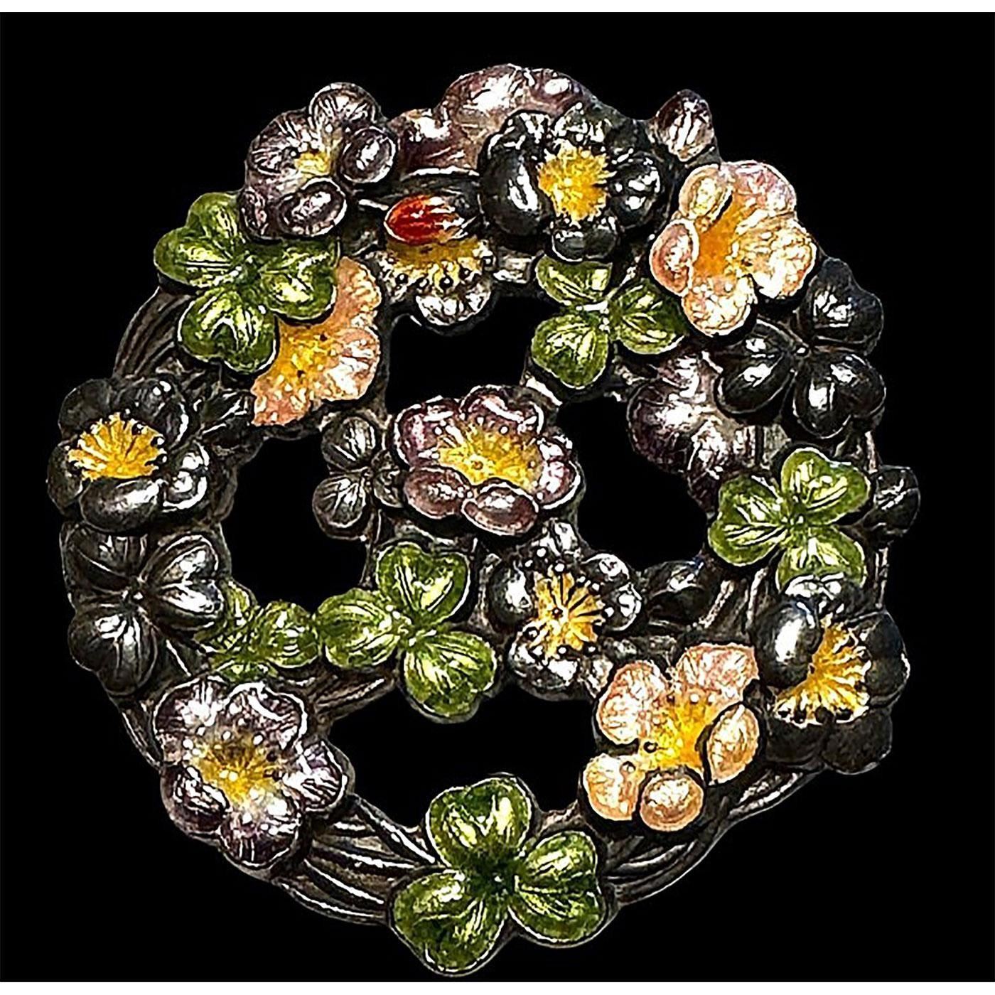 1 Large pierced 19th century repousse silver and enamel example. These Japanese Repousse enamel buttons are quite highly desirable among collectors. This pierced and very colorful example shows a multitude of different colored flower heads. The button is in very nice condition and has lots of enamel. Signed on the back and in a more unusual shape.